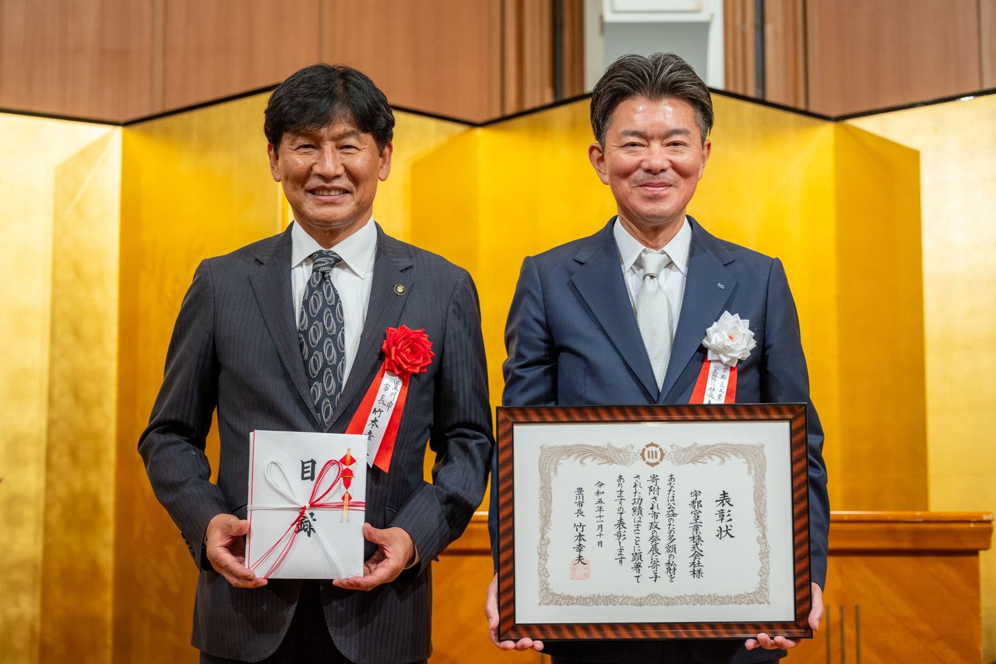 寄付贈呈式では、土井昌司社長から竹本幸夫市長へ「市内の人口増に役立ててください」と目録が手渡された。竹本市長は土井社長へ感謝状を贈った。同社は5年ごとに市への寄付を続けている。