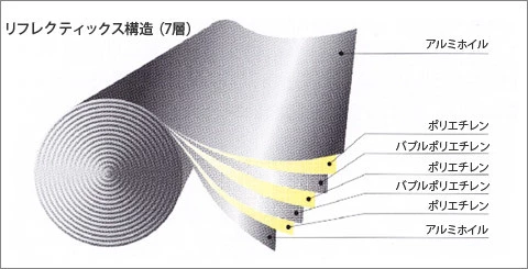 リフレクティックスの構造は、両面の高純度アルミ箔(純度99.99%)に、2枚のバブルポリエチレンシートと3枚のポリエチレンシートが内蔵された単純構造体です。また7層構造を支えているのは接着剤ではなく、最先端のプラズマ方式を採用し接着剤ゼロを実現しました。この高い遮熱性能をもつリフレクティックスは、暑さ寒さを快適に過ごす事に寄与した環境に優しい材料です。しかも経費の節約とエネルギーの節約に大きく貢献します。